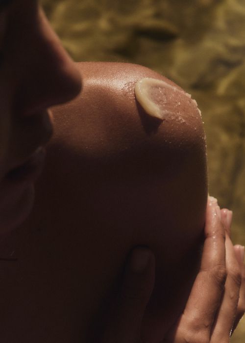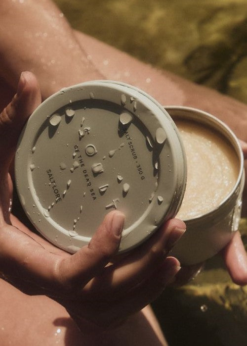 シャワーやお風呂で肌を濡れた状態にしておきます。“ソルト・ロア(SaltLore)”ボディスクラブをたっぷりとすくい取り、肌にのせてください。